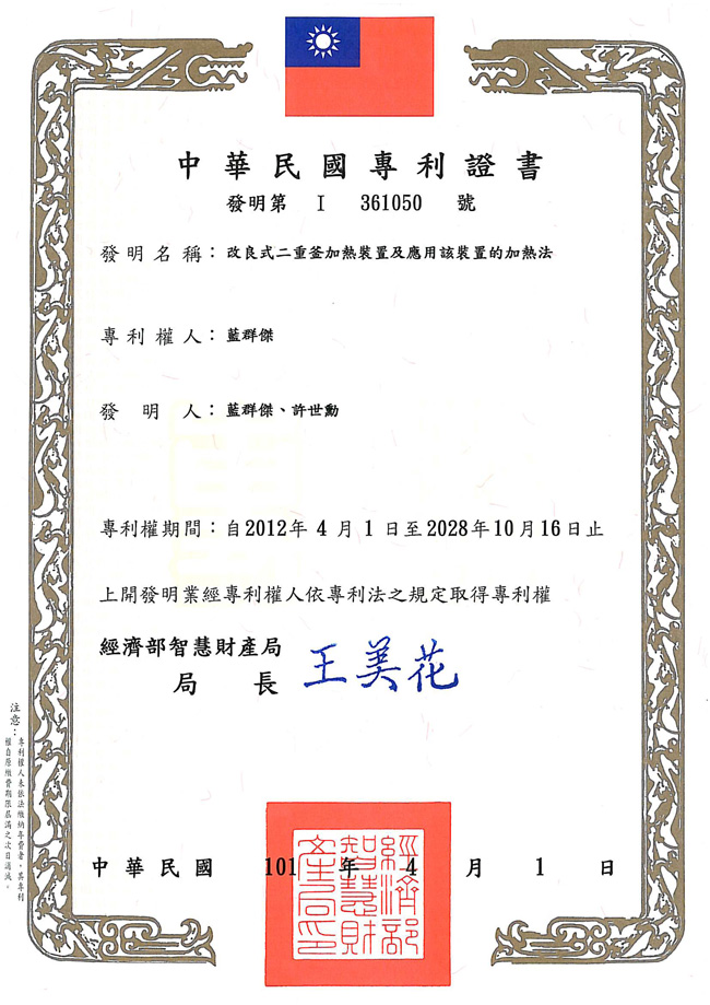 ●發明專利:改良式二重釜加熱裝置及應用該裝置的加熱法
